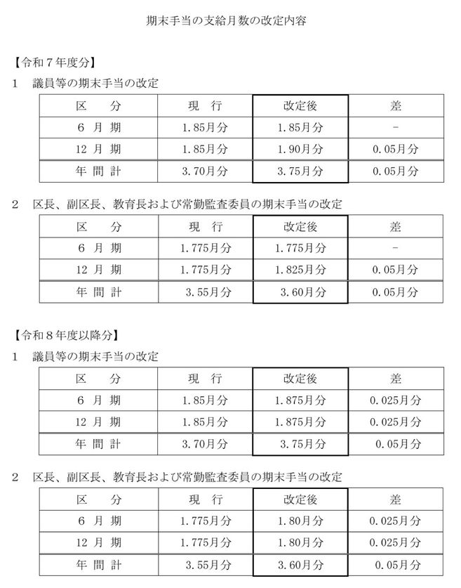 >公民較差を解消するため、給料月額を引き上げるとともに、期末手当および勤勉手当の年間支給月数を引き上げる。